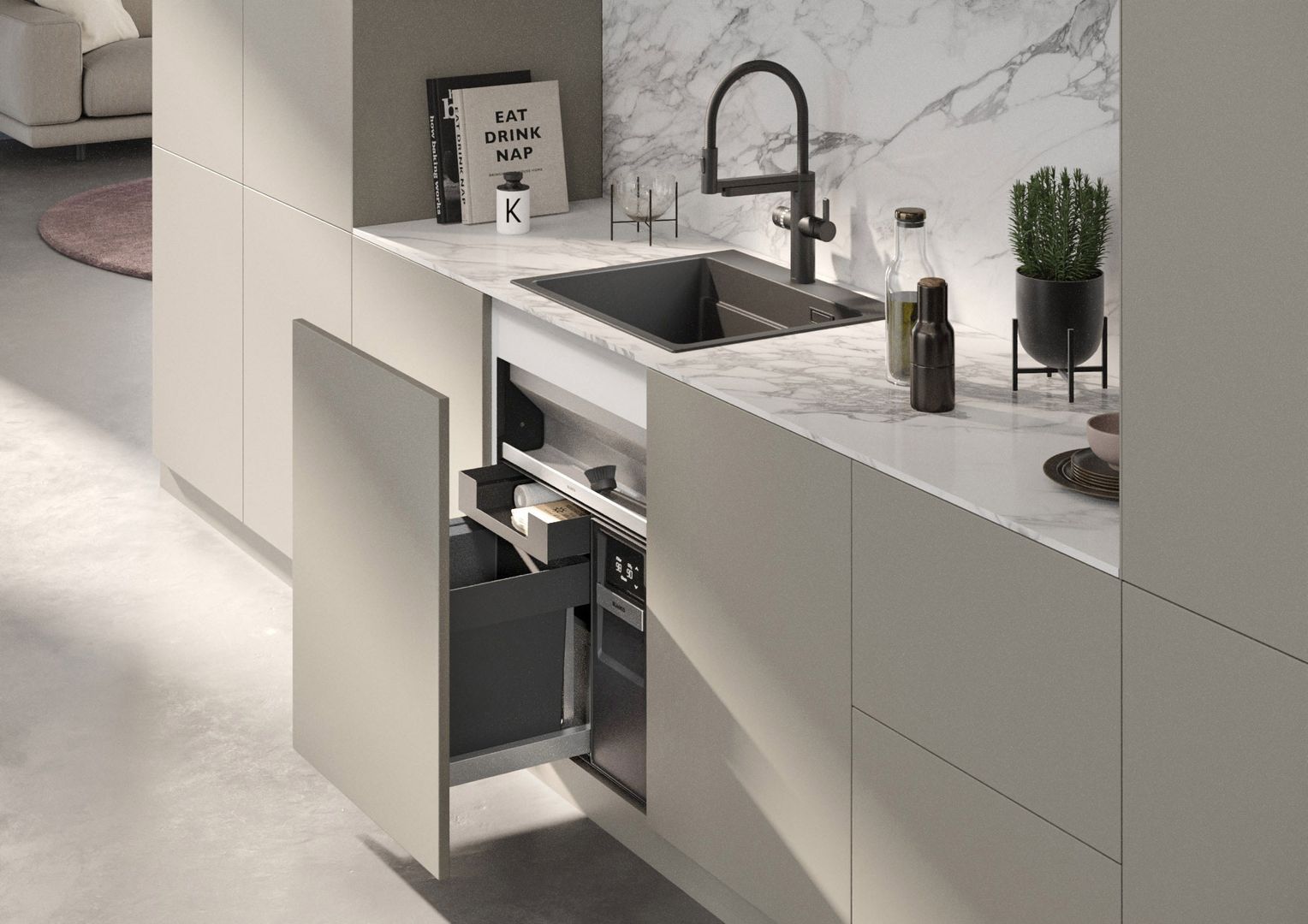 Profi-Tipp von Wohnstudio Hergetz: In der Küche geht es immer auch um Platz, Stauraum und darum, alles griffbereit zu haben. Clevere Lösungen schaffen Raum. Wenn Geschirrspüler, Küchenmaschinen oder andere technische Geräte intelligent angeordnet werden, kann jeder Winkel genutzt werden, was besonders in kleineren Küchen wichtig ist.
